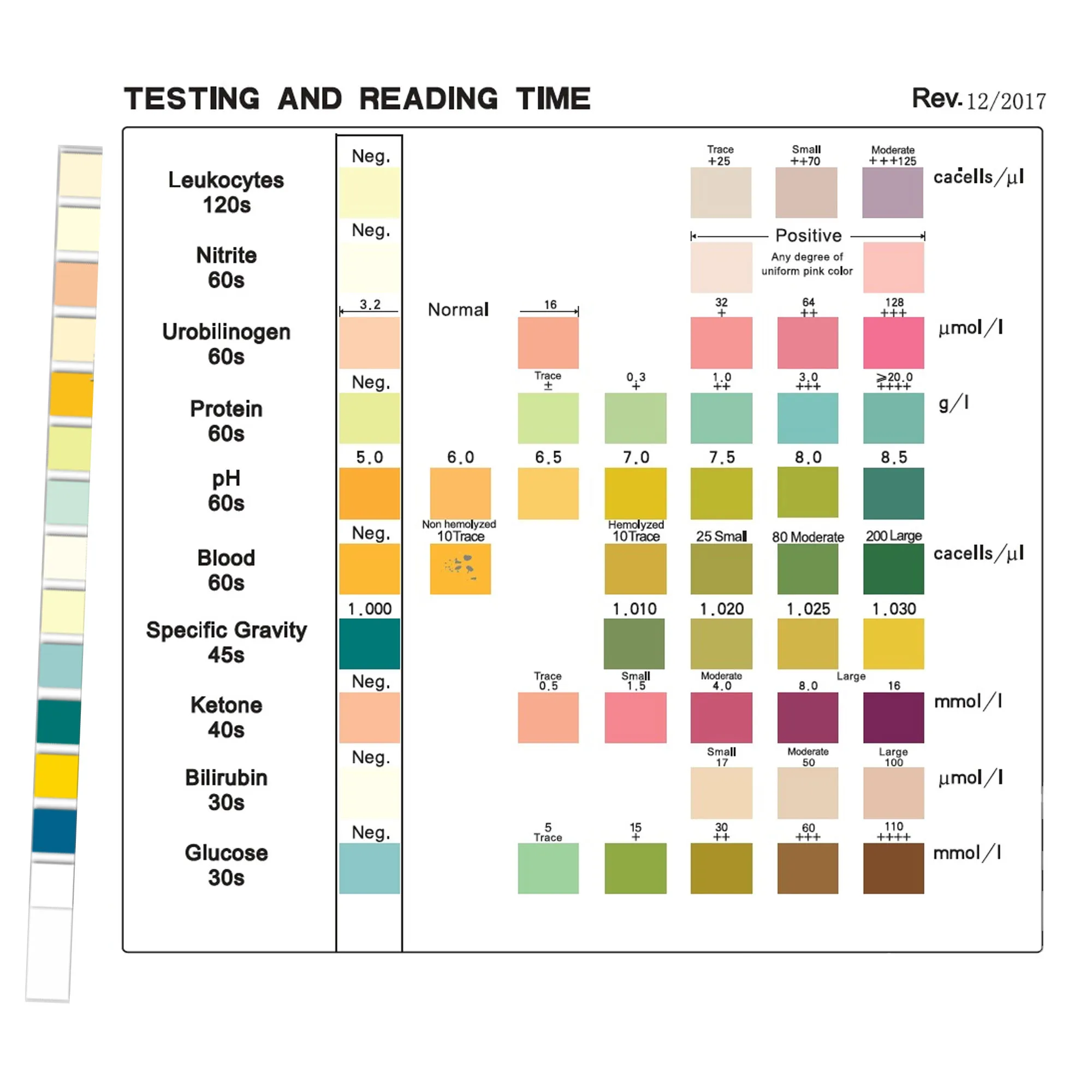Hold the urine test strip against the color chart on the product bottle to read the results. Make sure to read the correct parameter at the specified time.